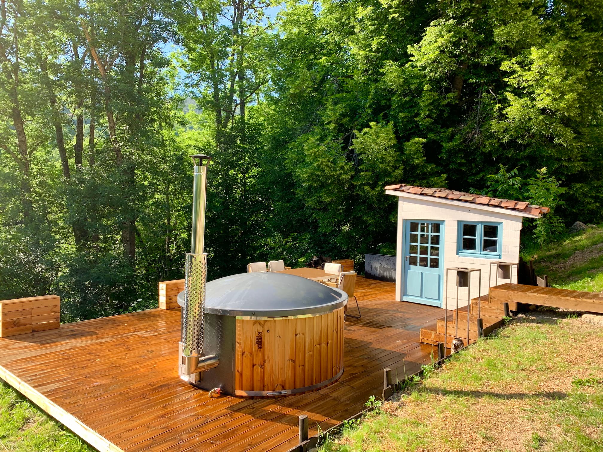 La maison est équipée d’un bain suédois extérieur donnant sur la forêt, ainsi que plusieurs terrasses. Découvrez les charmes du domaine pittoresque accroché à flanc de montagne, assis à la terrasse, en visitant le village avec son églises romanes ou lors d’un séjour …